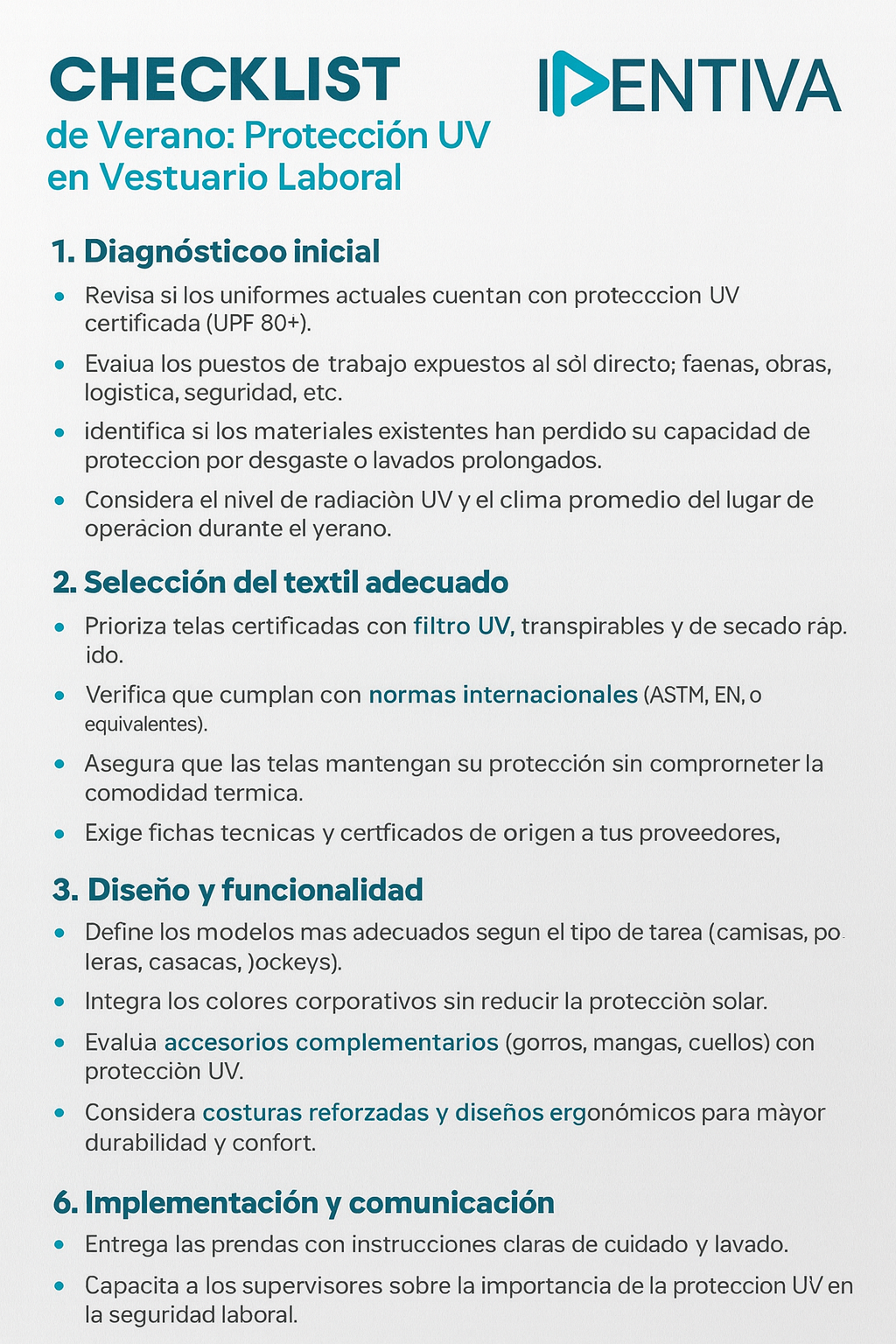 En Identiva, con más de una década de experiencia confeccionando vestuario corporativo, técnico y laboral, sabemos que cada detalle importa: desde la selección de la tela hasta la planificación de tallajes y la entrega final en terreno. Por eso, desarrollamos esta Guía práctica de protección UV en vestuario técnico, un checklist diseñado para ayudar a las empresas a evaluar, planificar y mejorar la protección de sus equipos frente a la radiación solar.